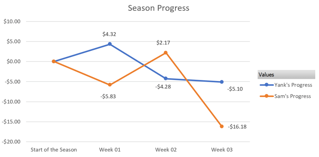 Wouldn’t you know it, in the Monday night game, I bet on the best HC/Offense combo in the league twice (including in The Confrontation, sorry Sam) and it saved my bacon. Most importantly, we are on to week 4.