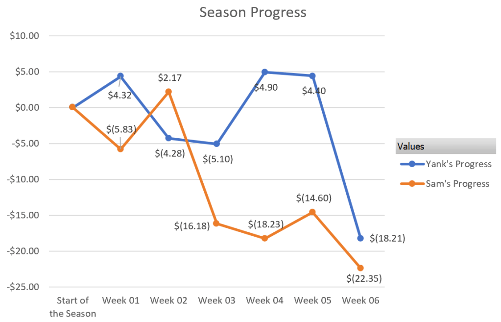 I made up some ground on Yank in the Confrontation by taking the Titans over the Texans. The Texans tried their best, but OT was the nail in the coffin for this one. Once the Titans got the kickoff, it was pretty much a sure thing that Derrick Henry would find a way to the endzone and hit the over for me. In the Isolation, I split my picks. The Steelers made us feel silly for not picking them as our Collaboration by demolishing the Browns, but they’ll be making another appearance this week. The Colts ultimately secured the W, but got off to too slow of a start to cover the 8 points I paid for against the Bengals. Yank’s weekly Chief’s 1st Half Over bet didn’t hit again sadly, leaving him with a big ole donut in the wins column this week. Tough.