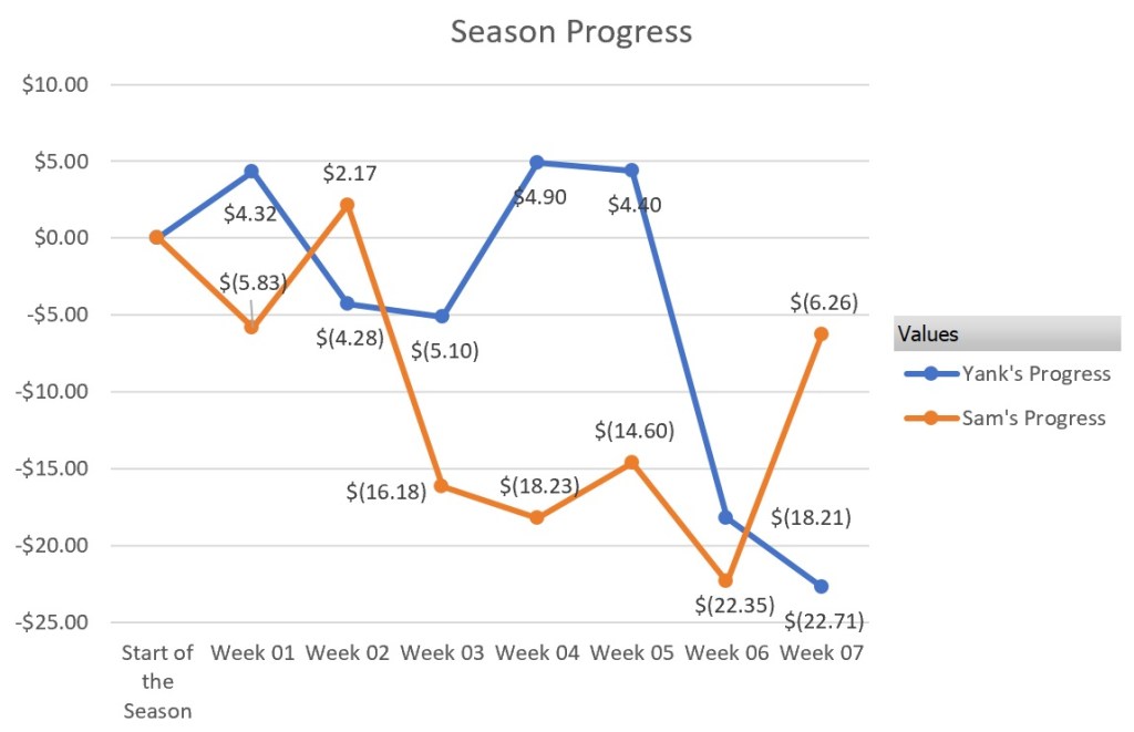 We’ve gotten into the meat of the season now. Many of the teams are who we thought they were. Your boys are who you thought we were too; dumb and bad at gambling. At least Sam has been able to find some momentum. Let’s get into the recap.