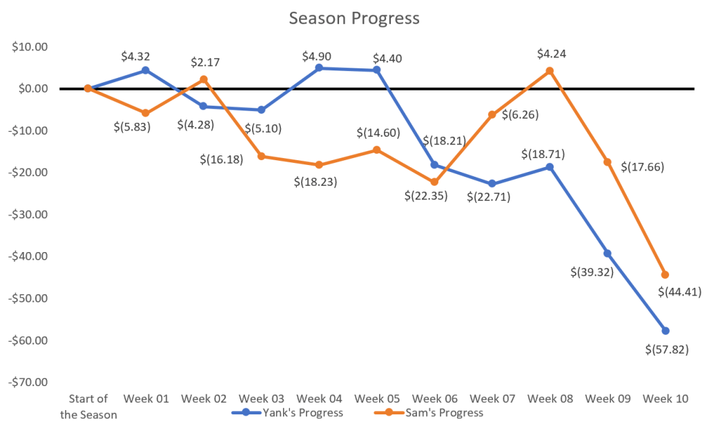 As you can see, we picked two winners who didn’t cover and were on some questionable coaches – LaFleur, Lynn, Kingsbury. The plan is to get back to Principle 1 and win some money this week, so the best advice I can give is: fade us if you ain’t us. On to Week 11!