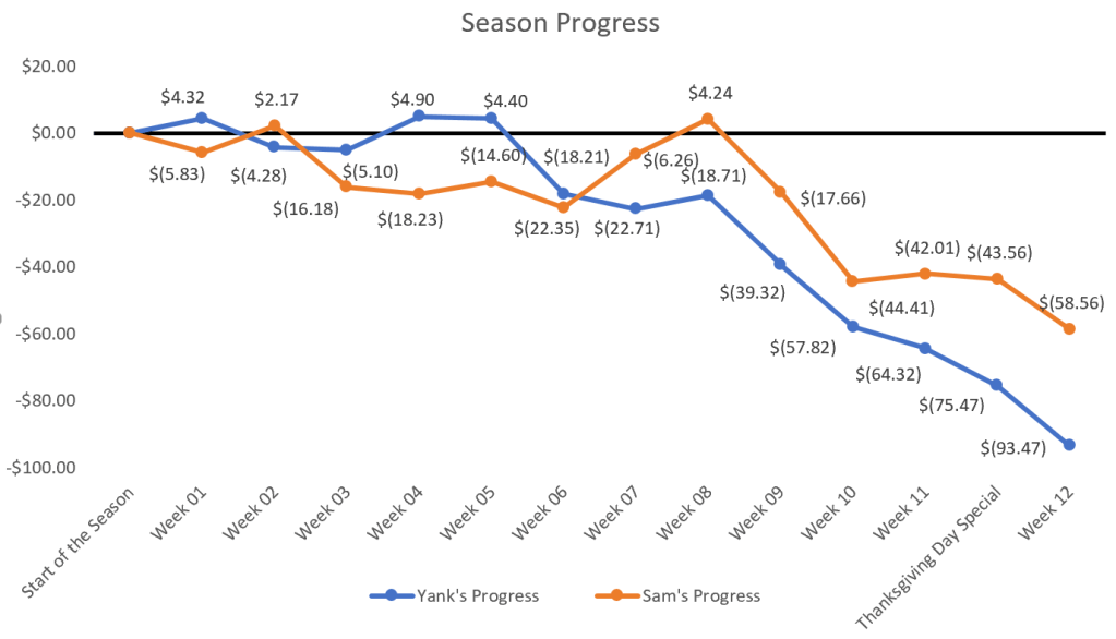 As you’ll notice from the chart below, Yank has a total of $6.53 left in the bank for this season. Given how close he is to hitting the $100 floor, Yank has opted to forgo the Confrontation and the Isolation for this week. We agreed that with a balance of under $15, you are allowed to make just 1 pick, but that you must spend the amount you have remaining in the bank. Before diving into how Yank is going to stave off bankruptcy, a quick recap of what didn’t work last week.