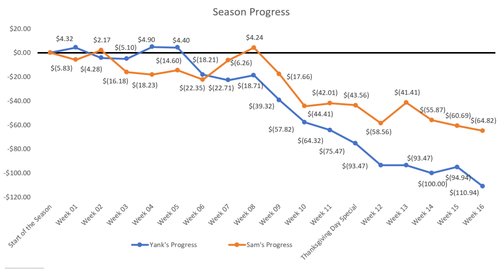 There’s not a lot to write home about from last week, but we are excited to finish this marathon slog through bad picks and bad breaks. Week 17, here we come!