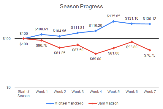 Sam: As I mentioned already, I’m doubling down on the strategies. This is the 2nd of the strategies approach to my picks. This line has moved dramatically towards the Colts over the last week, and as far as I can tell that movement is not injury-related. It opened at Titans-1 and has moved all the way back to Colts-2.5 and even -3 in some cases. That’s strategy 1. Strategy 2 discusses taking more underdogs, but what’s implied in that statement is that you have to take teams that you normally wouldn’t. That’s the Colts for me. I was on them early this season and they turned me away with some poor performances, but they’ll probably still be a .500 team, which gives them a shot to win this one. And strategy 3 is that we get the lines early or jump on lines that are moving asap. In this case, I got the line while it was still a pick’em. And while the strategies are mostly in alignment here, I also think the Titans might not be as hot as they seem after beating the Bills and Chiefs. It’s a stock-up game for them against a division rival they’ve already beaten once this year. Yank likes to point out that it’s hard to go 2-0 against division opponents so that looks favorably for me here. Finally, when you look at some metrics, these teams might not be all that different and may even favor the Colts despite their record. According to Football Outsiders, the Colts are #15 in total DVOA and the Titans are #20 in total DVOA. Furthermore, the Colts have the #1 ranked defense in Rush DVOA and the Titans have the #22 ranked defense by DVOA. So, the Colts have a favorable defense going up against Derrick Henry and shouldn’t have too hard of a time moving the ball against the Titans defense. Let’s see if they can get it done.