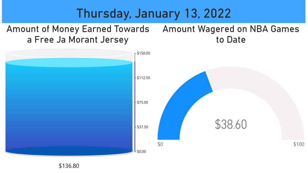 Back in the black! Albeit barely… but winnings are winnings. I was all over the Thunder grabbing a victory in Brooklyn and wished I had doubled down on it even more. My other bet of the night was so close. Just kidding. The Bucks waxed the Warriors. Meanwhile, my non-bet reverse-jinx of the Grizzlies worked and they took care of business against the Timberwolves.
