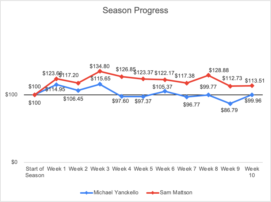 Sam: The other day I was listening to a podcast with a bettor that has a proven track record of success. One of the things he mentioned was the importance of finding angles or trends that provide edges and sticking with them (if they’re working, move on if you start losing too often). Yank and I have gone back and forth over the years of trying to balance takes and opinions with the strategies that are in theory opinion-proof (as we’ve said, we’re bad at gambling). So what this interview helped shine a light on for me, is that there is room for your opinions, and takes so long as they might provide an edge. Well, one of our takes has been that this was going to be a good year for the Ravens and that with an MVP in Lamar at QB, their potential was high. That hasn’t played out exactly right so far this year, but they’ve been close. Whether it was going up 21-3 against the Bills in the first half or leading by 3 touchdowns in the 4th quarter over the Dolphins, all before falling apart at the seams, I think this well-timed bye week is exactly what the Ravens need to get back to the team we thought they would be and they’ve demonstrated they can be.