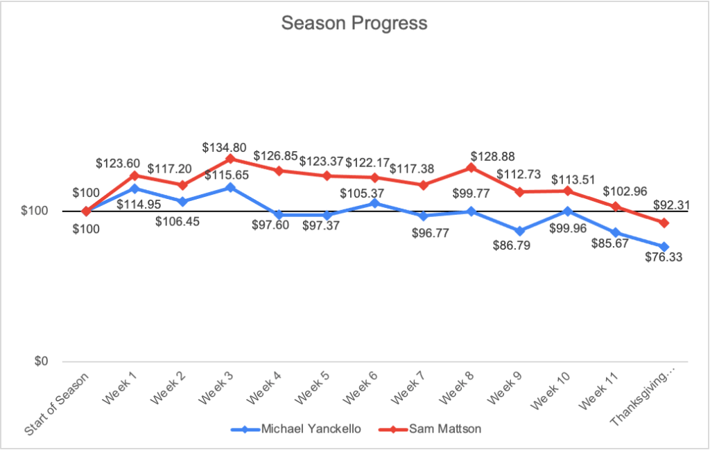 On the week of feasts, we have unfortunately been eating a few bitter meals here on the blog. After week 10 where we could do no wrong, in week 11 we could do no right. All of our picks were competitive but none of them came through. That theme unfortunately continued to several of our Thanksgiving picks. Hopefully, we finished eating our vegetables and can find some dessert starting this week.