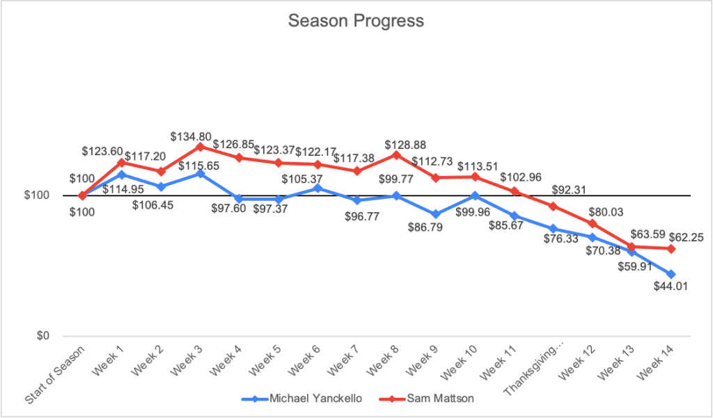We’re dumb and bad at gambling. That’s been the motto of this blog since we began. Nothing proves it quite like the last few weeks. Our football takes have been prescient but we have negative dollars to show for it. As we definitively enter winter, the weather outside is frightful, and frankly, the game results have been spiteful. We’re hoping for some better luck as we go. Let it snow, let it snow, let it snow.