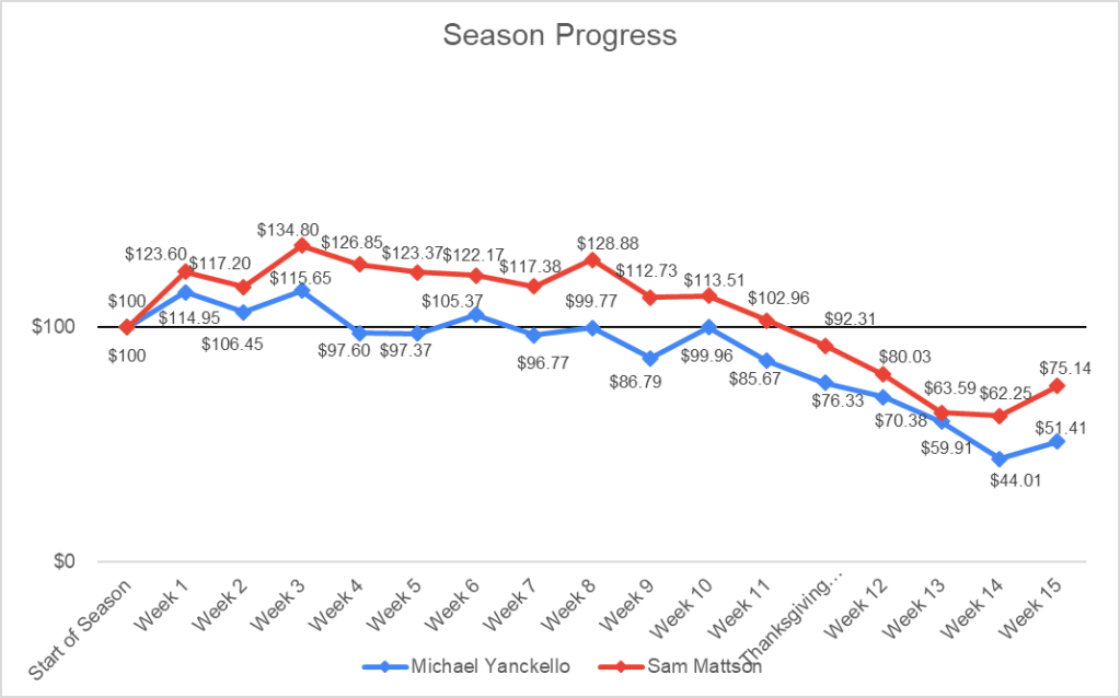 Finally, in our Isolation picks, Yank had the biggest present under the tree with a win straight up on the Steelers spread and fancy Steelers/Bengals ML parlay. On my end, the Titans did enough to deliver me a push, which probably amounts to unwrapping underwear on Christmas morning as a kid; helpful, but overall kind of lame.