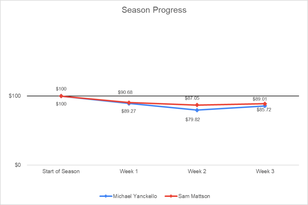 Last week our results were good, bad, and ugly. On the good side of the ledger, the Packers came through for us in Lambeau (albeit after some serious doubts), Sam also had the Phins and the Eagles and I had the Lions, Bills, and the Pats all of whom came through. The bad was teasing our good Chiefs pick with our bad Cowboys pick when one of our only reliable takes is tease killer teams come through every week. However, the ugliest part was our continued belief in mediocre teams like the Vikings and Ravens in either-or games. We are going to spend more time trying to identify clear talent gaps or mismatches as opposed to betting on gut feel. I actually won money for the first time in a while on OLL last week, let’s make it two weeks in a row.