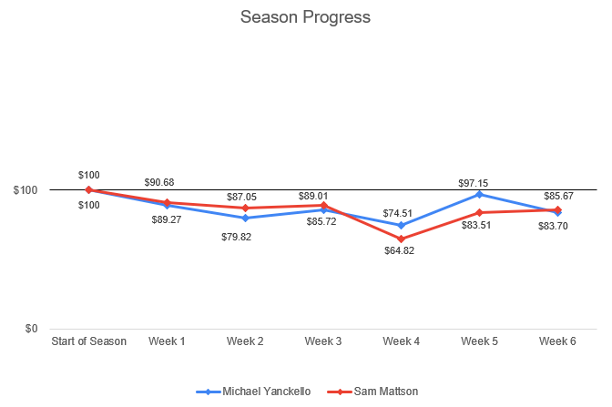 Week 7 is here – the NFL season is fully in the swing of things but Yank and I are still trying to find our way. After a successful Week 5, Week 6 didn’t prove as fruitful as we hoped. Here’s a look at what happened.