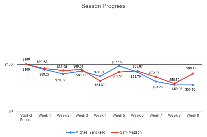 We had one of our best Collaborations of the year last week nailing the Eagles and the Colts. We also felt good about our Texans pick which of course didn’t cover…by one point…because their kicker got injured. Sam was also all over the Raiders and Vikings for a nice little week in the black. I took a shot on the Bills and was rewarded with another loss. When will I learn that I should just be listening to Sam? Maybe next week.