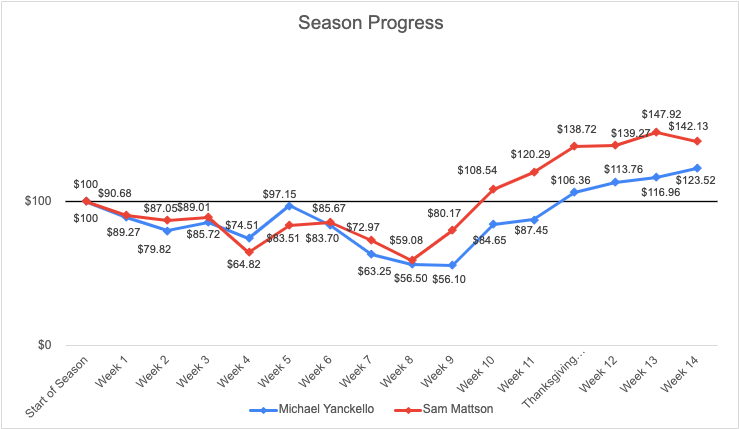 Yank: I know this is somewhat of a bad idea before we even get started. I’ve made a lot of hay this year betting ON the Cowboys (who I hate) and at least profiting off of my sadness. That said I like going against the team everyone was most impressed with the prior week in a clear letdown spot, and that is absolutely Dallas this week. Additionally, this Dallas team thrives in a track meet, but Buffalo in December is not a great place to host one. Meanwhile, the Bills are catching their stride at the right time, giving me the vapors from those Giants teams that got hot late in 2007/2011, and I think they could legitimately go on a run. I’ll take my chances with the Bills in this one.