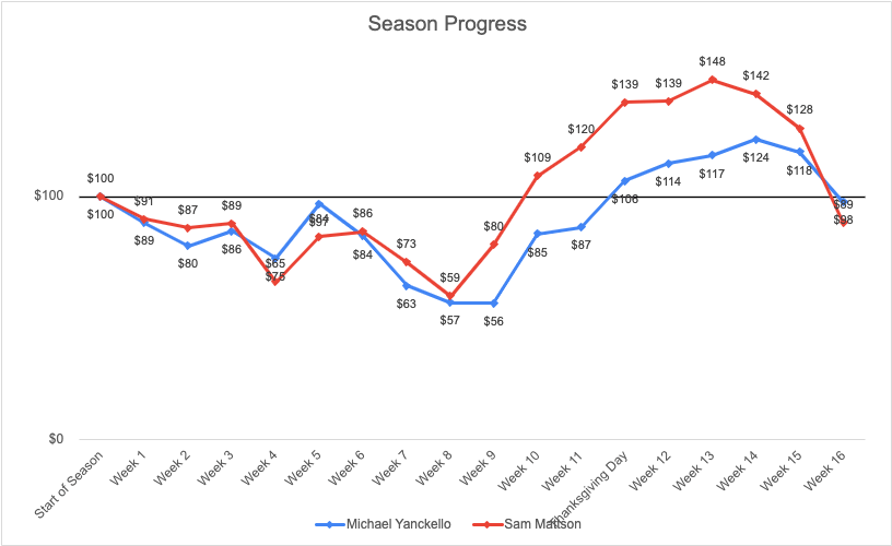 Last week was actually so bad, I’m even interested in rehashing every loss – and yes – I mean every loss. What I will say is that I lost every bet and 39 cold hard dollars, while Yank lost all but the one bet above for a total of -$20.60. Even though we’ll remember this week in our bones, we’re actively choosing to forgive and forget. Week 17 couldn’t come fast enough.