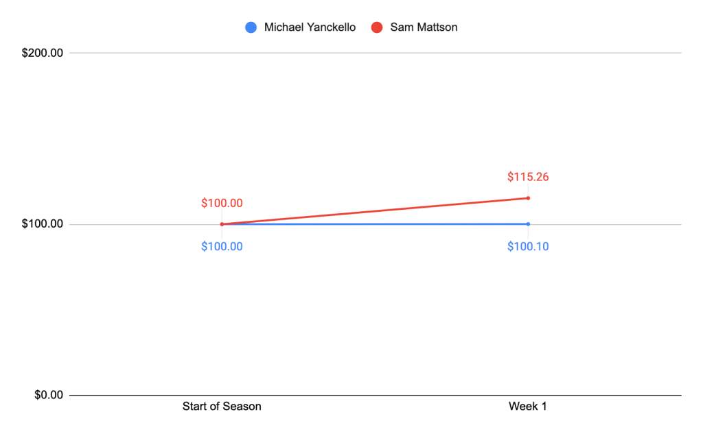 Sam: Cowboys, Cowboys, Cowboys. I’m expecting the Cowboys to make a lot of money for me this season, especially early. As I said last week, the public narrative is out on the Cowboys for not doing much in the offseason, but they essentially brought back a 13-win team and upgraded at defensive coordinator. We’ll see if Zimmer’s scheme can last, but I’m sure it’ll catch people off guard to start the season. Meanwhile, for the Jets, I’m expecting them to bounce back a little against a lackluster Titans team. Levis is the perfect QB to get trashed by the Jets defense, even if they didn’t look so good against the 49ers.