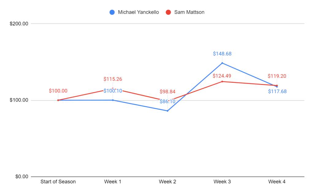 Sam: I went from swearing off the Panthers for the rest of time to betting them 5 weeks in a row. I’m not sure why they’re my team of destiny other than I don’t think they’re as bad as everyone else thinks they are. Meanwhile, I think the Bears are worse than everyone thinks.
