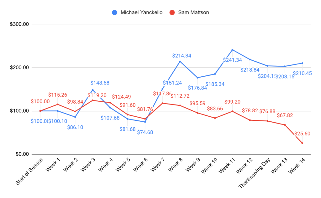This week we gave games featuring Mac Jones, Jameis Winston, Jake Haener, and Tommy DeVito. It’s grey and cold out most places but still too early to really think about the holidays. It’s Week 15 of the NFL season baby, feel the excitement! Lucky for you all(or maybe unlucky?) Sam and I aren’t on the injury report so read on for our picks!