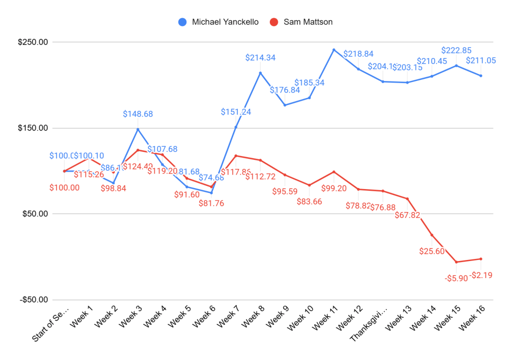 Sam: Unfortunately for Yank, the Giants absolutely stink right now. It’s in their best interest to lose every game and secure the rights to draft Shadeur Sanders #1 overall. By NFL Law, when your team enters full-on tank mode, you are allowed, if not required, to bet against your team and secure at least some benefit in your direction.