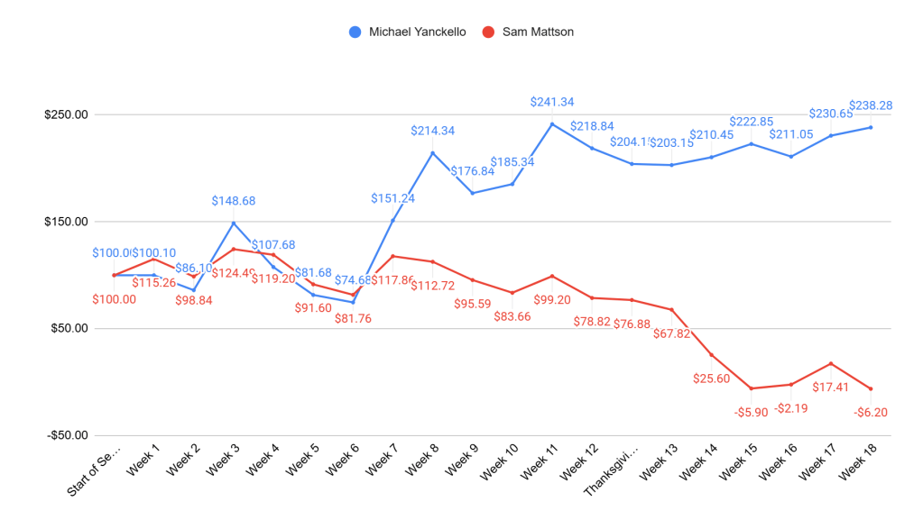 Sam: As much as it pains me to say it, I do think the Packers are a good football team. That being said, Barkley and Hurts should do a number on this defense. Love will have a few spectacular throws, but loves to go full Brett Favre at times. Even though I don’t like the Eagles, they’ve played better down the stretch and seem to have those early season jitters out of the way.