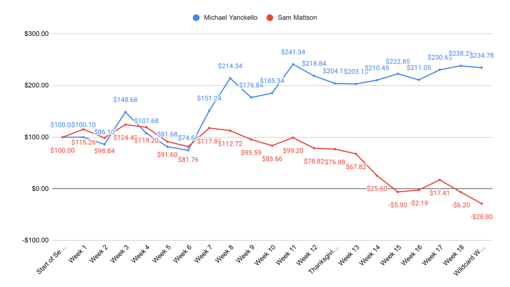 Last week turned out about as well as it has for me all season. Yank managed to only lose a little, while I keep diving deeper into the red. I’m letting Yank’s strategy guide me this week because I lost the taste for football after my team no-showed in a neutral environment.