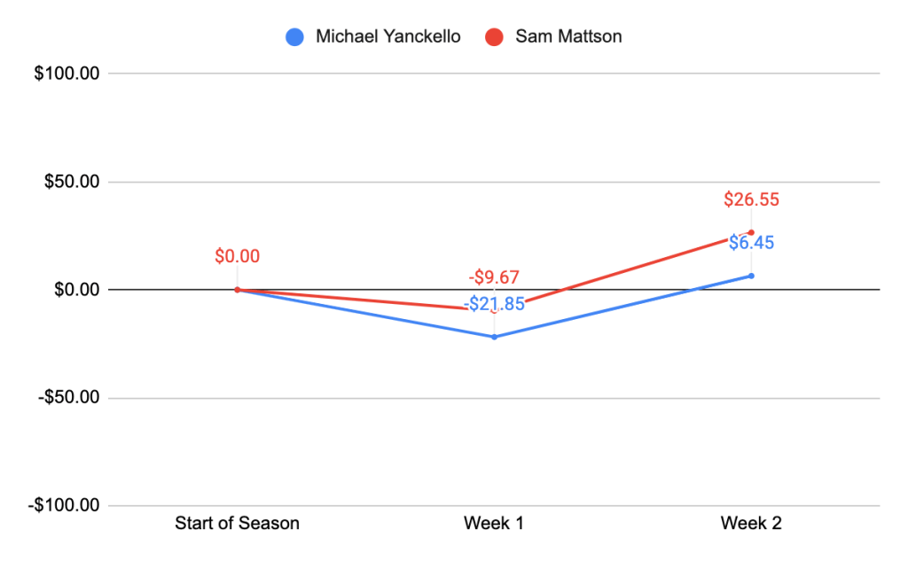 Welcome to Week 3! Oh, how Sundays can’t come soon enough, but they move along too quickly. Week 1 weirdness settled down into what we thought would be more of the norm in week 2, highlighted by OLL’s thrilling ML Parlay of the Week win thanks to Baker’s last-minute heroics. We’ll mostly be sticking to the course with our preseason takes this week, plus our first DiNucci’s Law sighting!