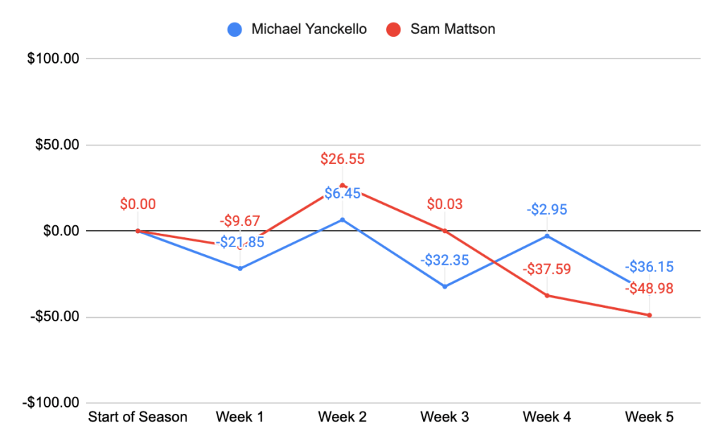 Sam: I’m probably going to bet the Packers every week. They should be able to beat the Bengals by a million, right? I’ve been told they have the best offense and defense in the NFL! Meanwhile, I like the Lions’ smash-mouth game against a Chiefs team that has its offense going a bit, but isn’t yet playing complementary football.