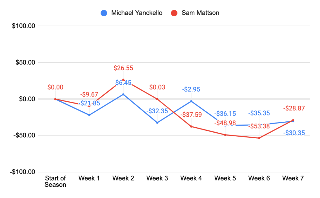 Sam: Despite Dalton being the QB for the Panthers this week, this pick makes me nervous. The Bills haven’t looked sharp since Week 1. That being said, I’m holding my breath and going with our principles. They should take care of business, right?